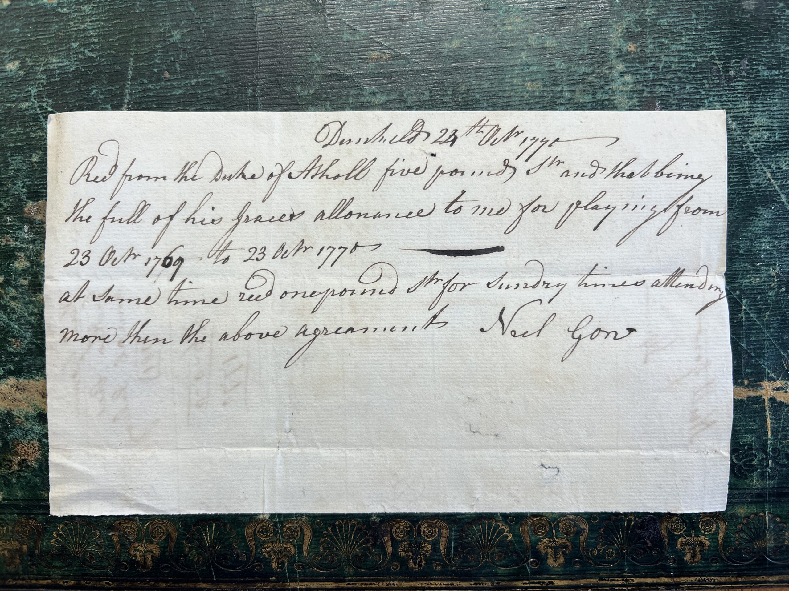 Niel Gow’s wage receipt from the Duke and Duchess of Atholl (Images provided with the kind Permission of Blair Atholl Estate Archives)